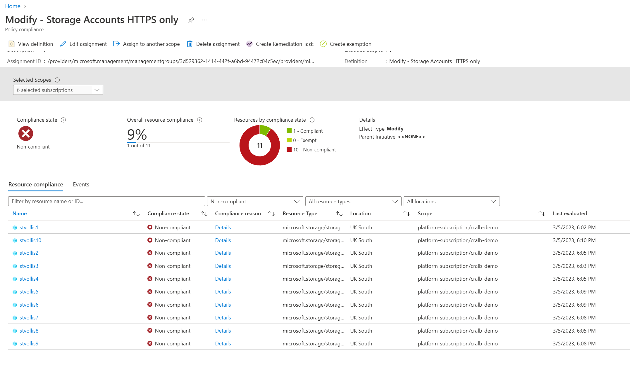 What if we had existing resources? What would happen? I will unassign the policy, deploy ten storage accounts and reassign the policy. The below script will do this.