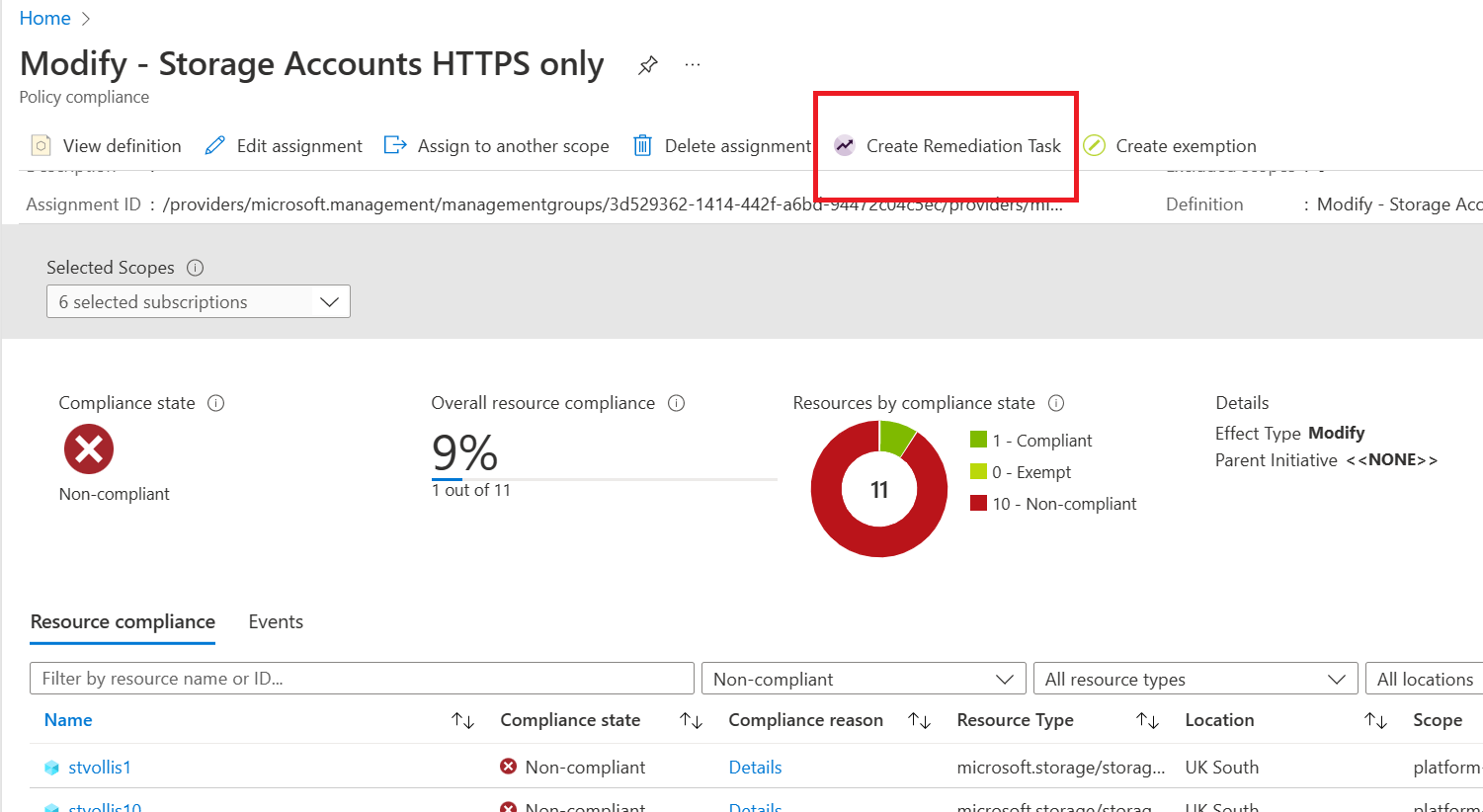 As expected - the modify policy won't automatically remediate existing resources that have already been deployed (Remember, I had unassigned the policy); however, with a modify policy you can run something called a remediation task. Running a remediation task will bring the resources into compliance.