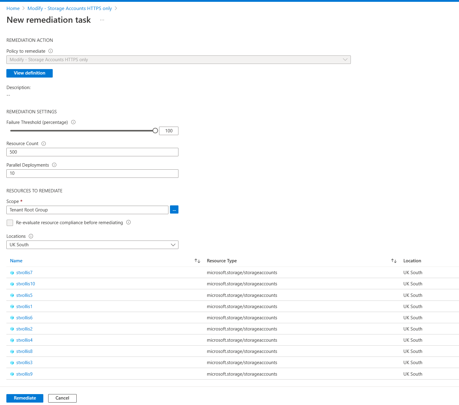 The remediation task will highlight all the resources that will be remediated in this task. You can change some configuration settings around the resource count and how many parallel deployments you want. However, we shall stick with the defaults. Once happy, select remediate.