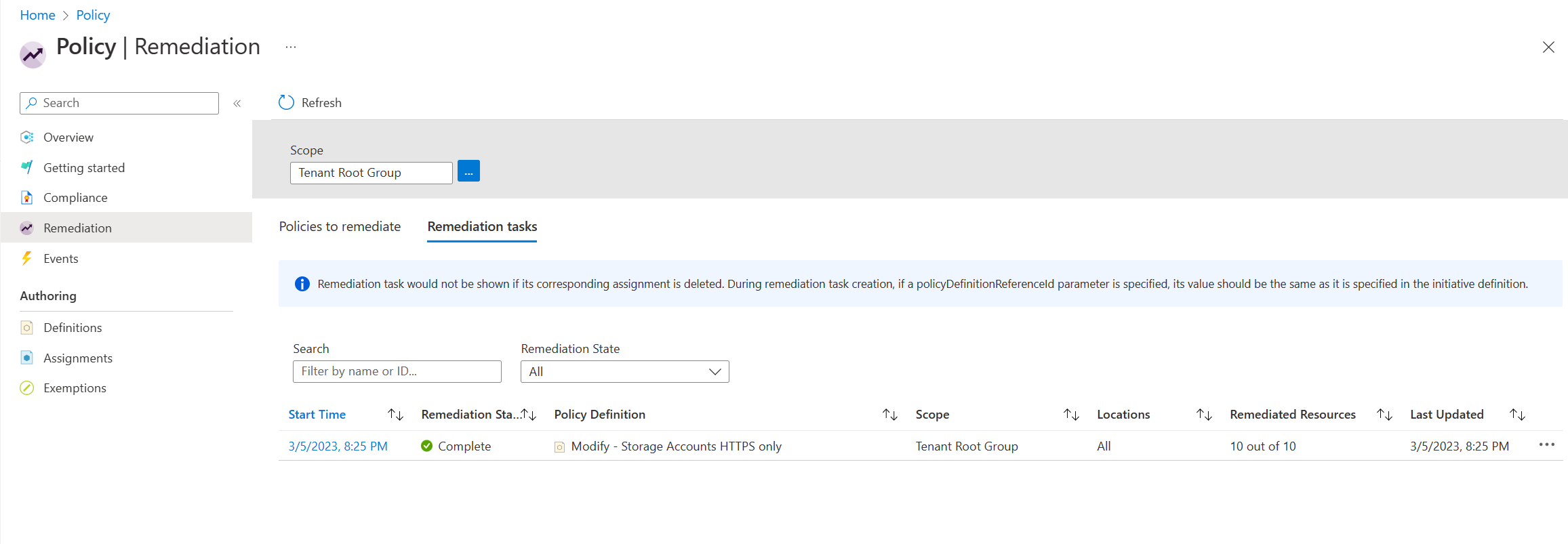 Returning to Azure Policy, there is a dedicated section for remediation tasks, and we can see that our new task has started and been completed already. There were no additional issues or errors, which is excellent.