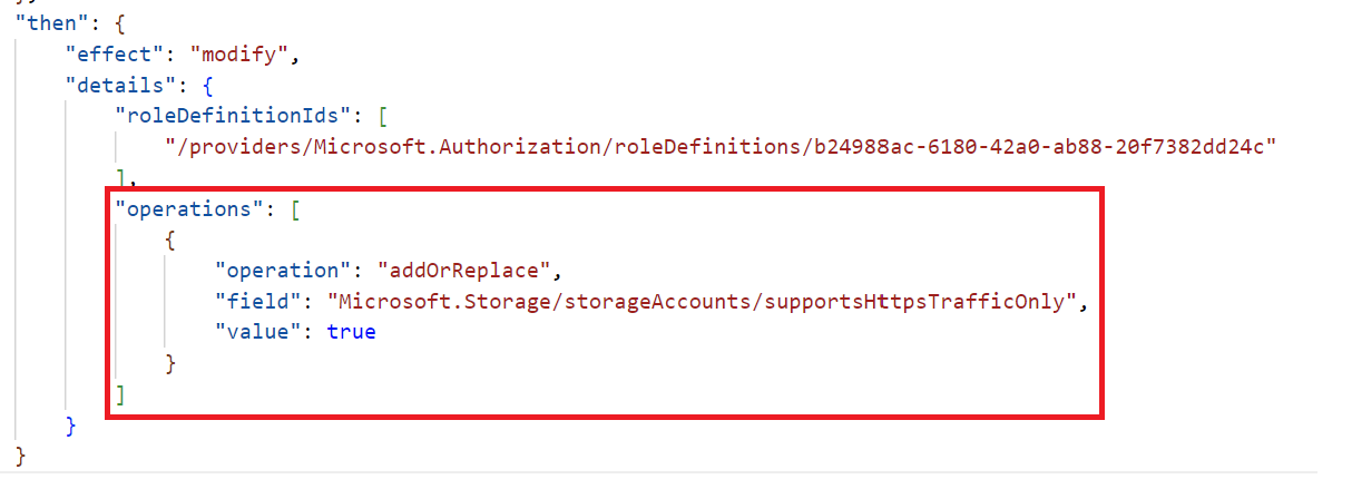 We then have the operations list block. In our scenario, we are using the addOrReplace operation on Microsoft.Storage/storageAccounts/supportsHttpsTrafficOnly field and the value to which it will be changed is true.