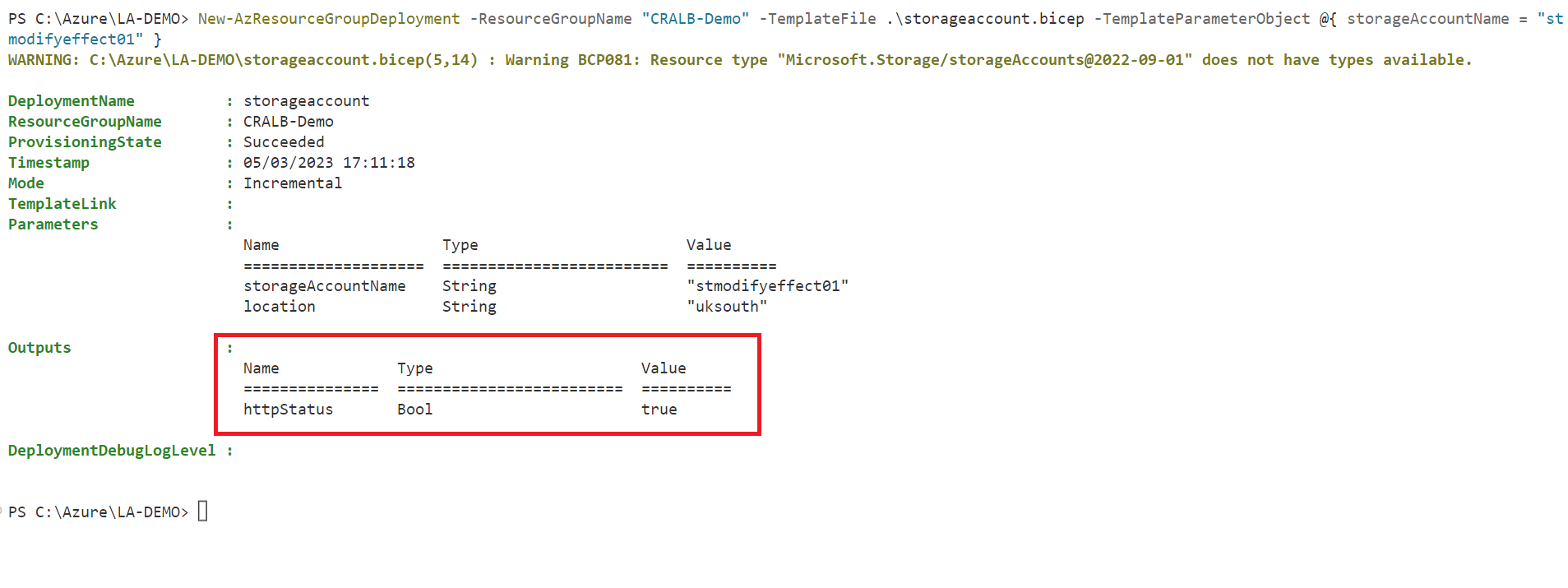New-AzResourceGroupDeployment -ResourceGroupName "CRALB-Demo" -TemplateFile .\storageaccount.bicep -TemplateParameterObject @{ storageAccountName = "stmodifyeffect01" }After the deployment, we are provided with an overview and values for the defined outputs. You can see that the httpStatus output has returned true - this means that the field supportsHttpsTrafficOnly must have been modified! Our code specifically asked for the field to be false, but Azure Policy ensured it wasn't.
