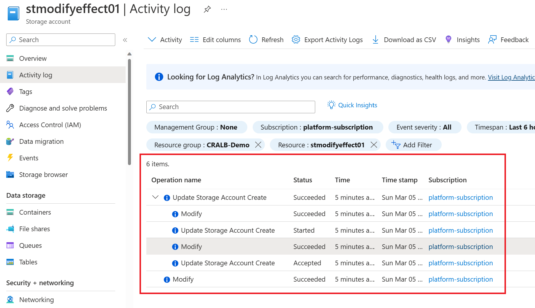 This is great, but how do we know the policy changed our field and ensured it was compliant? This is where we can view Azure Activity Logs. Going to our newly created storage account - we can start to investigate.
