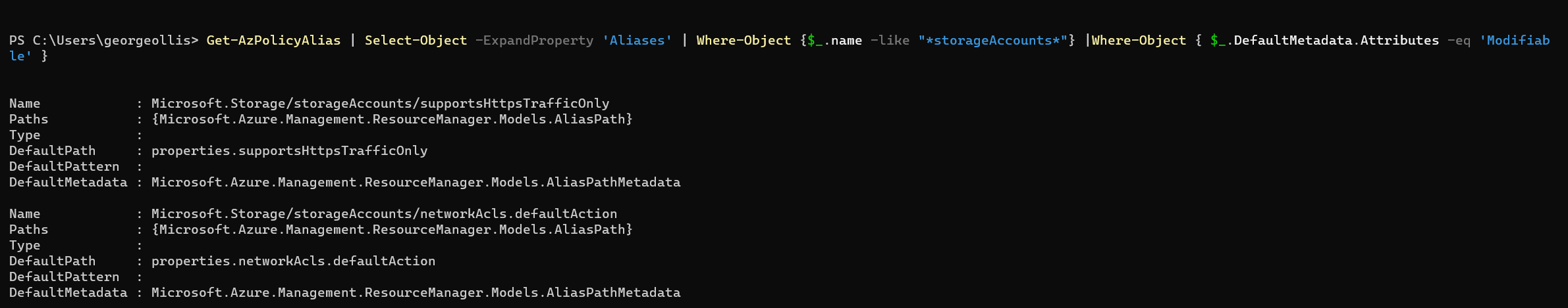 It's important to note that we must ensure that the alias we are trying to change is supported and can be modified when using the modify effect. The following PowerShell command can be used to confirm if a property can be used in a modify effect.