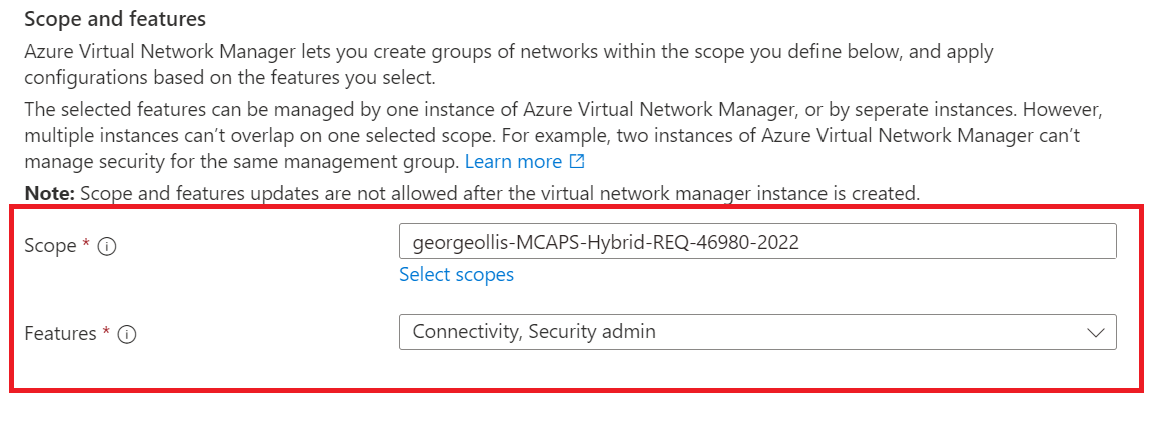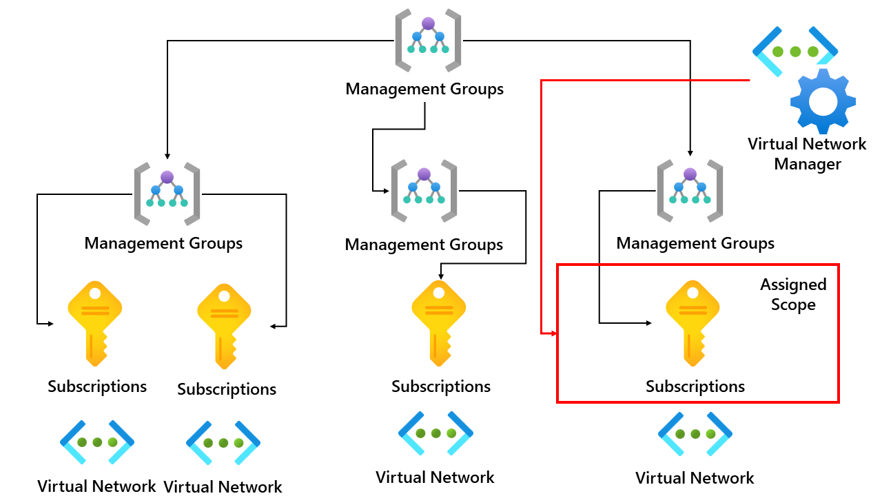 Scope defines the boundary of what virtual networks the virtual network manager resource can manage and control. This means that if we assign the scope to a single subscription, that virtual network manager resource can only manage virtual networks within that subscription. I created an overview below.