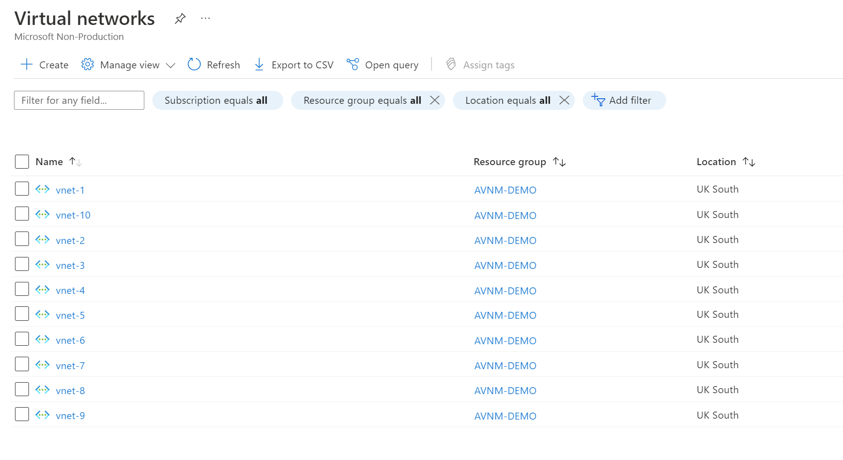 Once deployed, we should have ten virtual networks in one resource group, like the screenshot below. We also added a tag to the virtual networks resource with a key/value pair of env=test (You'll see why later).