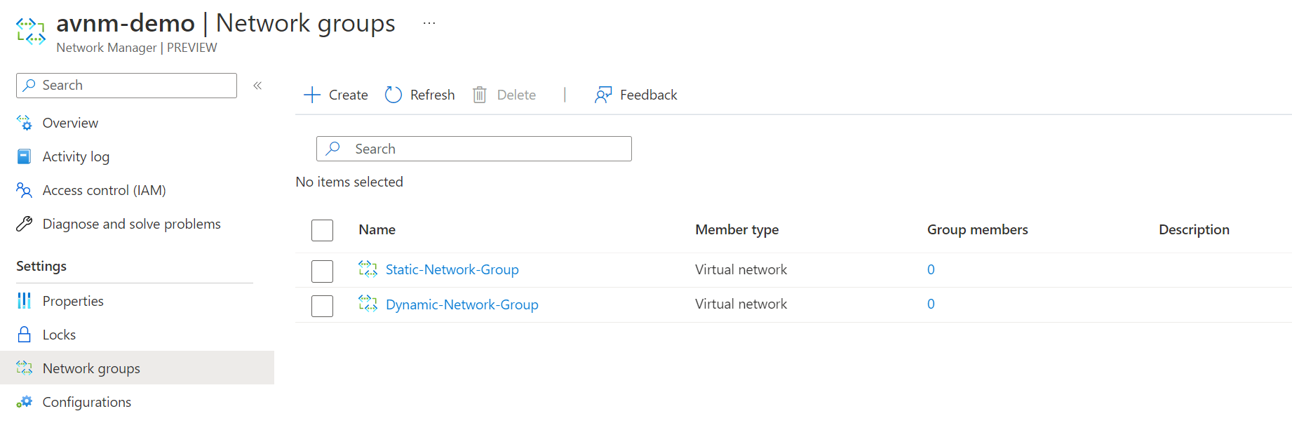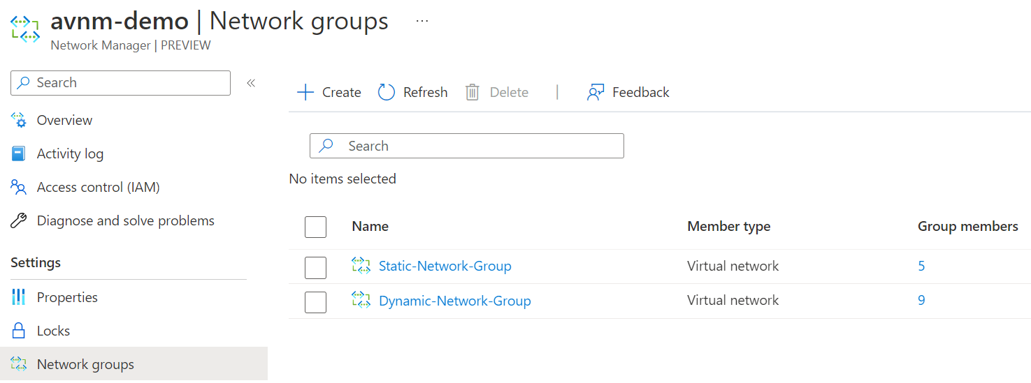 Once the deployment is finished, and we have the resource, it's time first to set up the network groups. Network groups are just groups of virtual networks. Network groups can be created statically or dynamically. An overview can be found below.