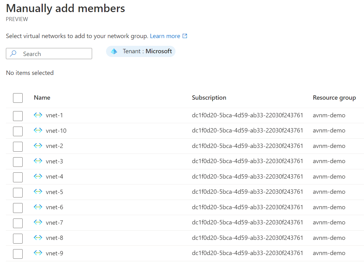 Once you've selected your virtual networks for the network group, you are finished. As you can see, statically assigning memberships is straightforward but may not provide you with true scalability and security, as you would need to monitor new virtual networks closely.