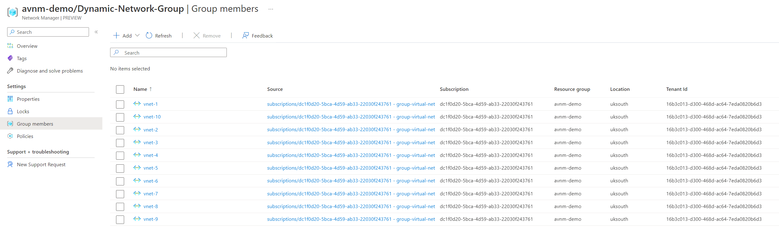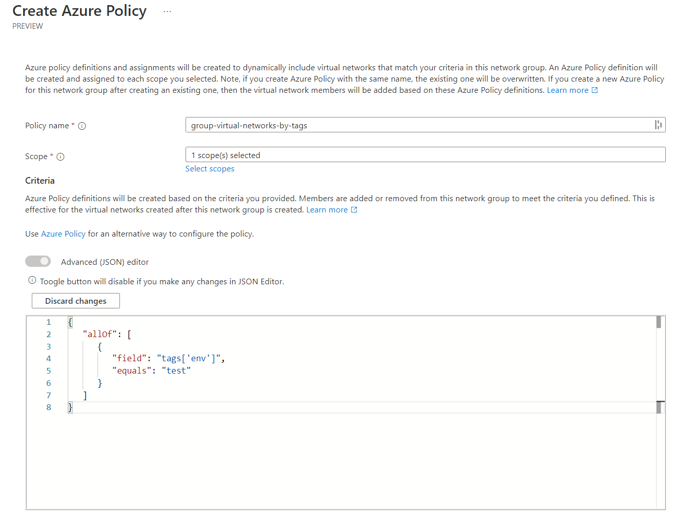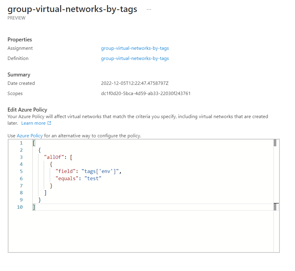 In our script at the start of the blog, we ensured that all virtual networks would have the key/value tag of env=test. We shall use this tag and value to add virtual networks to the network group.