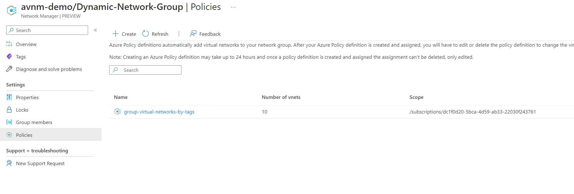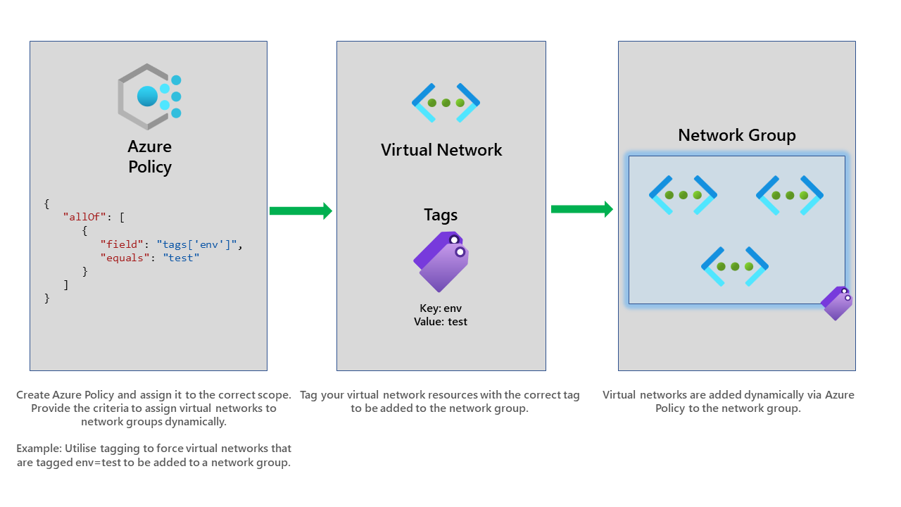 Now for the better solution, dynamic assignments of virtual networks into the network group. Behind the scenes, this uses Azure Policy to enforce, whereas static assignments do not use Azure Policy.