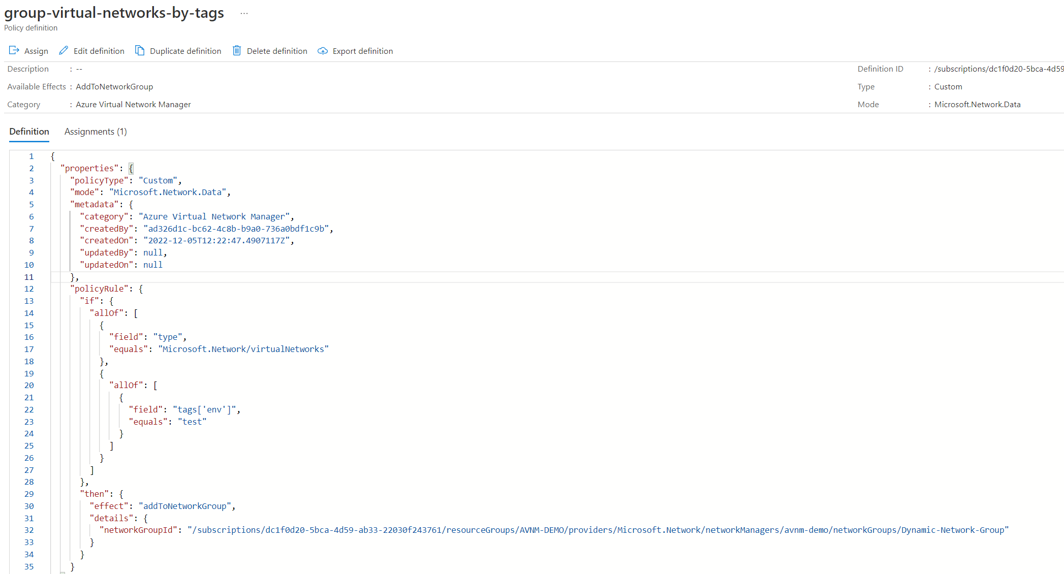 "networkGroupId": "/subscriptions/dc1f0d20-5bca-4d59-ab33-22030f243761/resourceGroups/AVNM-DEMO/providers/Microsoft.Network/networkManagers/avnm-demo/networkGroups/Dynamic-Network-Group"