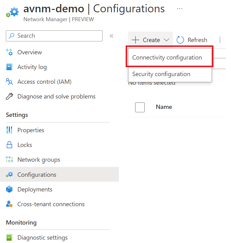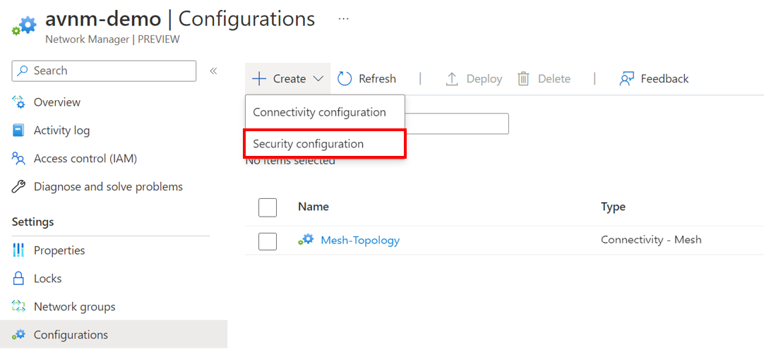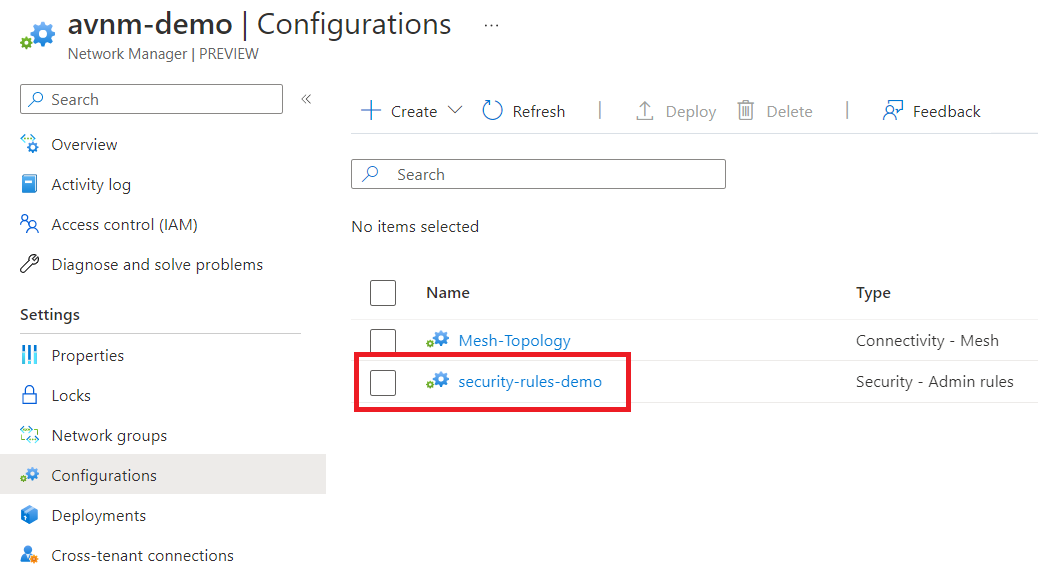 We already have our network groups and will use the same ones we previously deployed; however, we need to set up a security configuration. Go back to your AVNM resource and create a new security configuration.