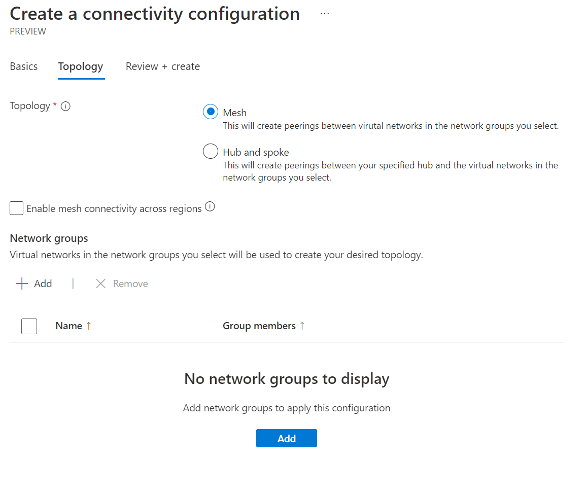 The connectivity configuration setting allows you to use two different networking topologies. One which we will use in this demo will be the mesh topology, but you can also use the hub and spoke topology.