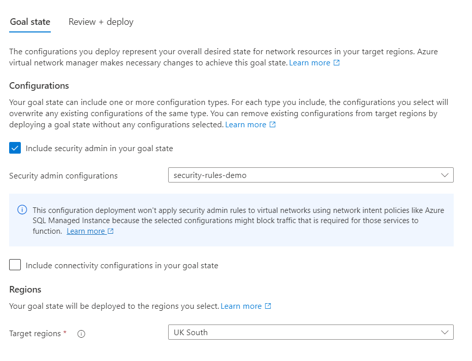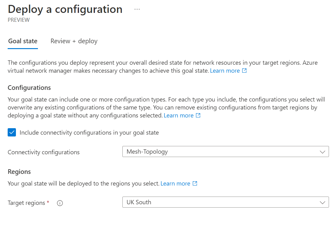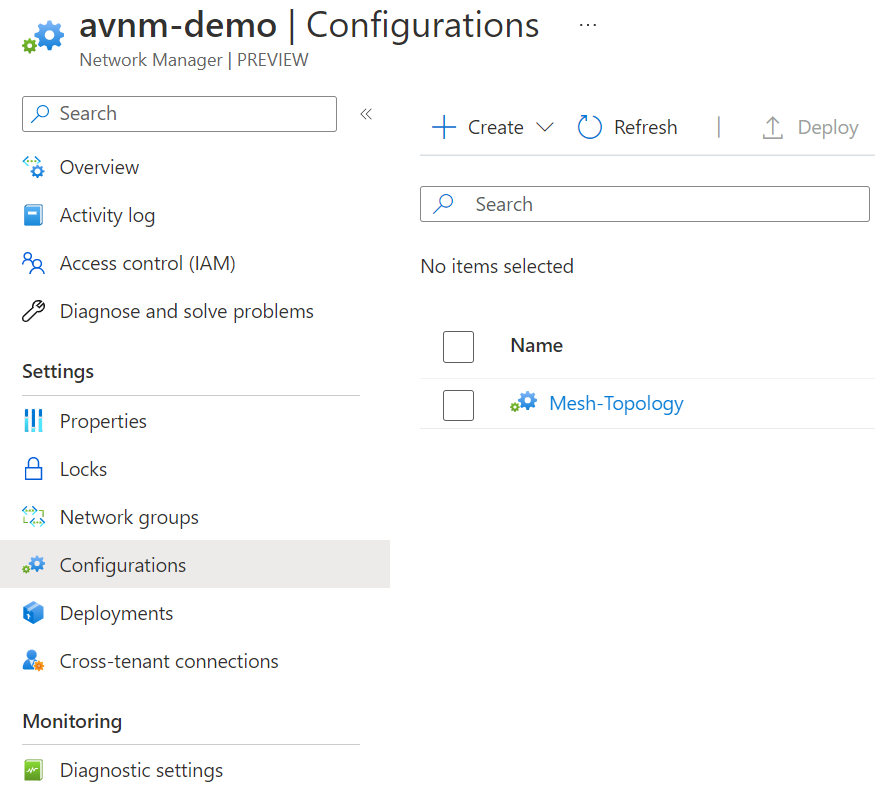 Click review and create. Note: This does not deploy this configuration to virtual networks. This creates the configuration; we still need to apply it. We will do this next through what AVNM calls deployments.