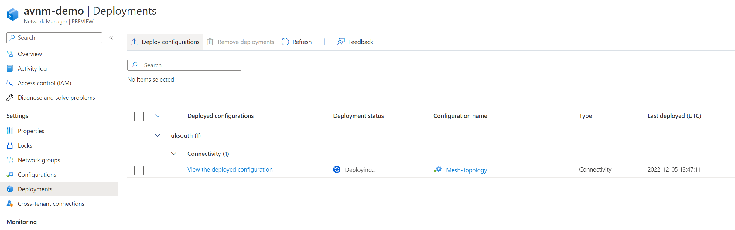 We can now monitor the status of our deployment. The deployment will go to complete once the configuration has been applied. Depending on your configuration and how many virtual networks are within your network group, this may take some time.