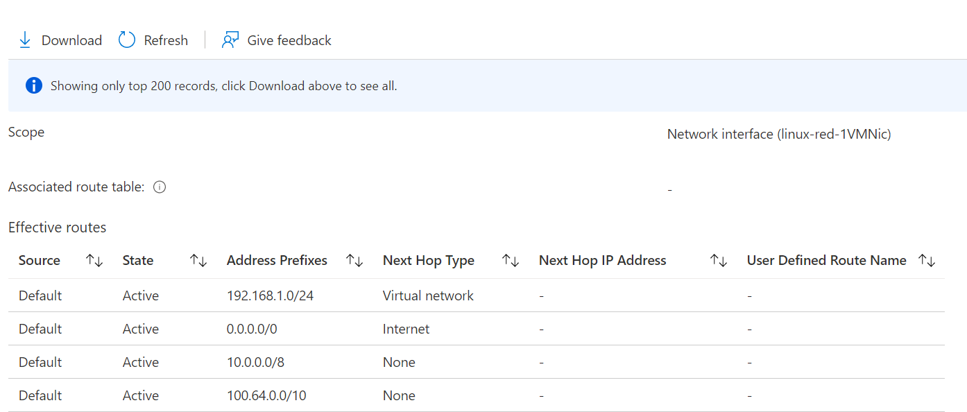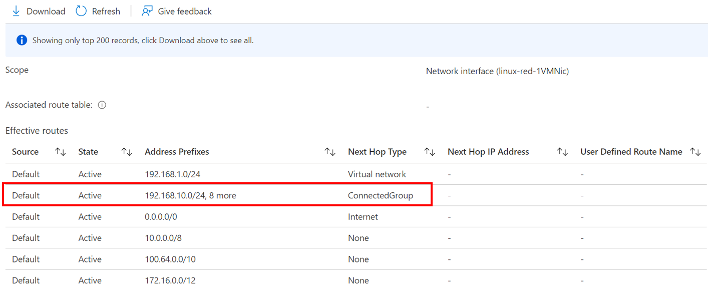 This is because it uses something called Connected Groups instead. If we look at the effective routes of the virtual machine, we can see the routes in the connectivity configuration, and our next hop is a connected group.