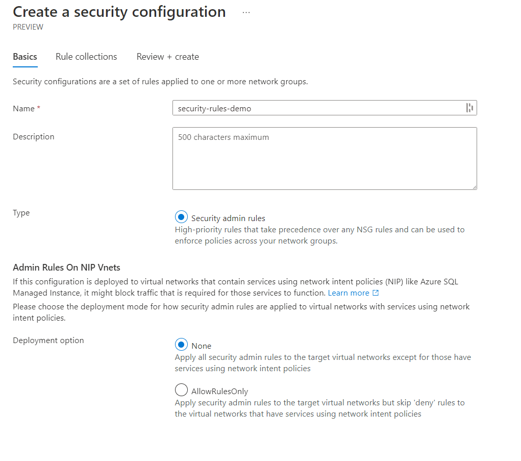 You'll be asked to provide a name for the configuration, a short description, a type (Which you can only select security admin rules) and the deployment options of None or AllowRulesOnly.