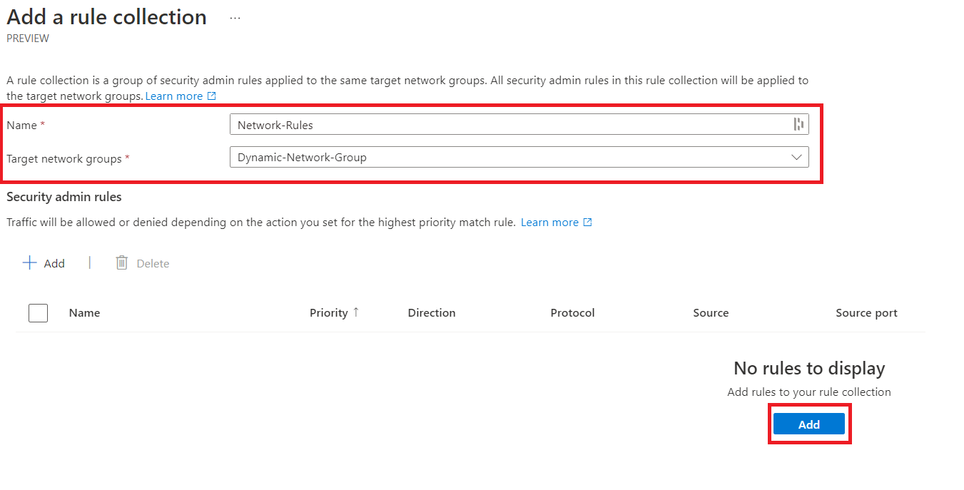 Click next and go to add a rule collection. Provide a name, select the network group these rules should apply, and then click add to create a new rule.