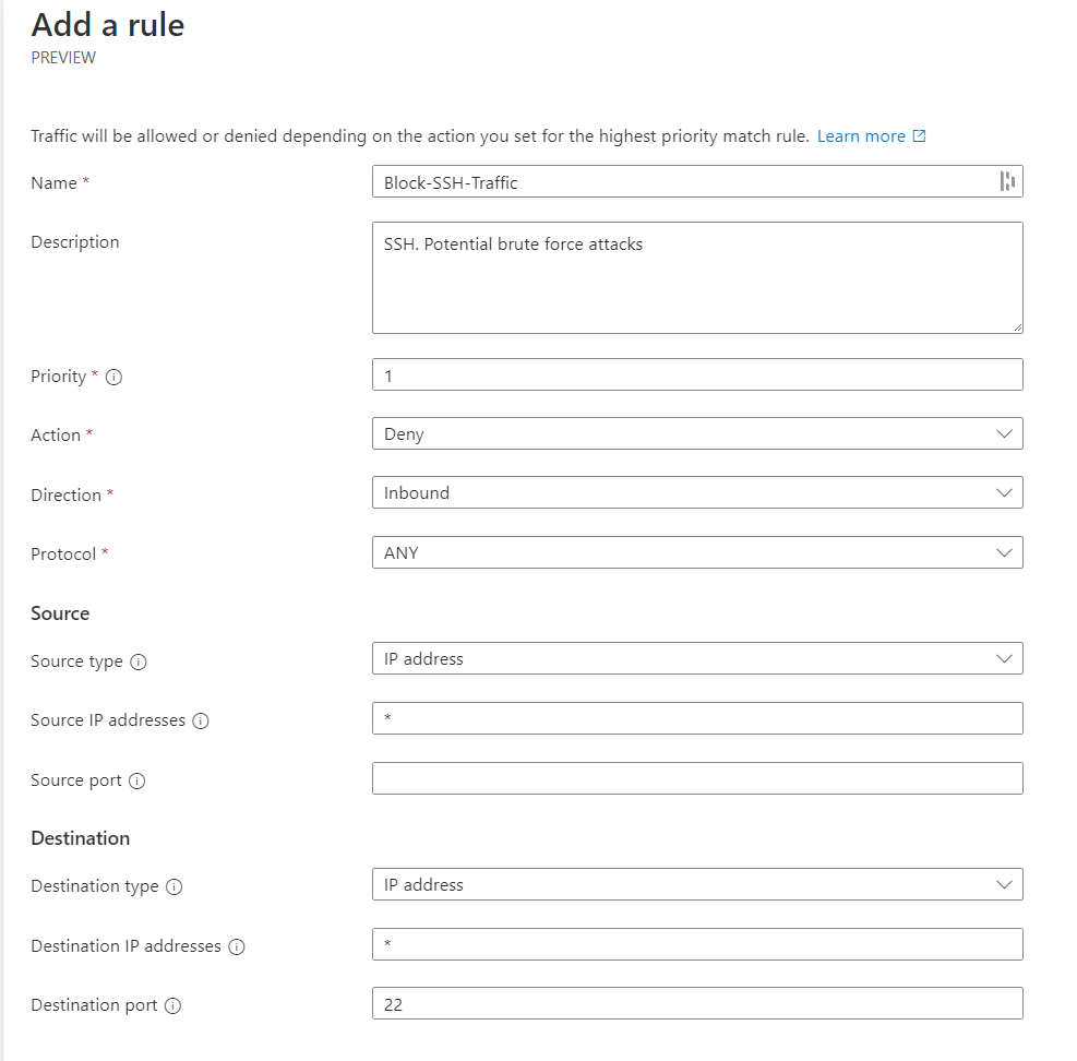 Let's go ahead and block port 22 inbound traffic; this configuration looks like the one below. Once that's been added, go ahead and save this configuration.