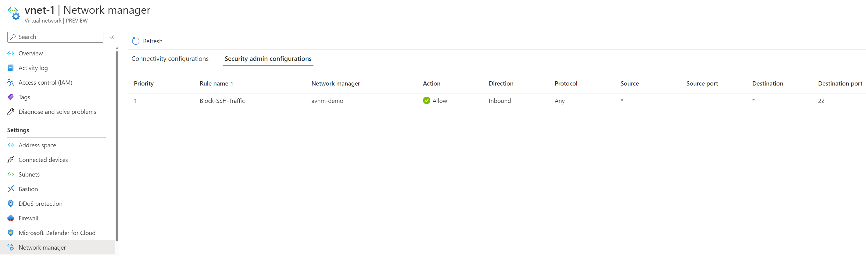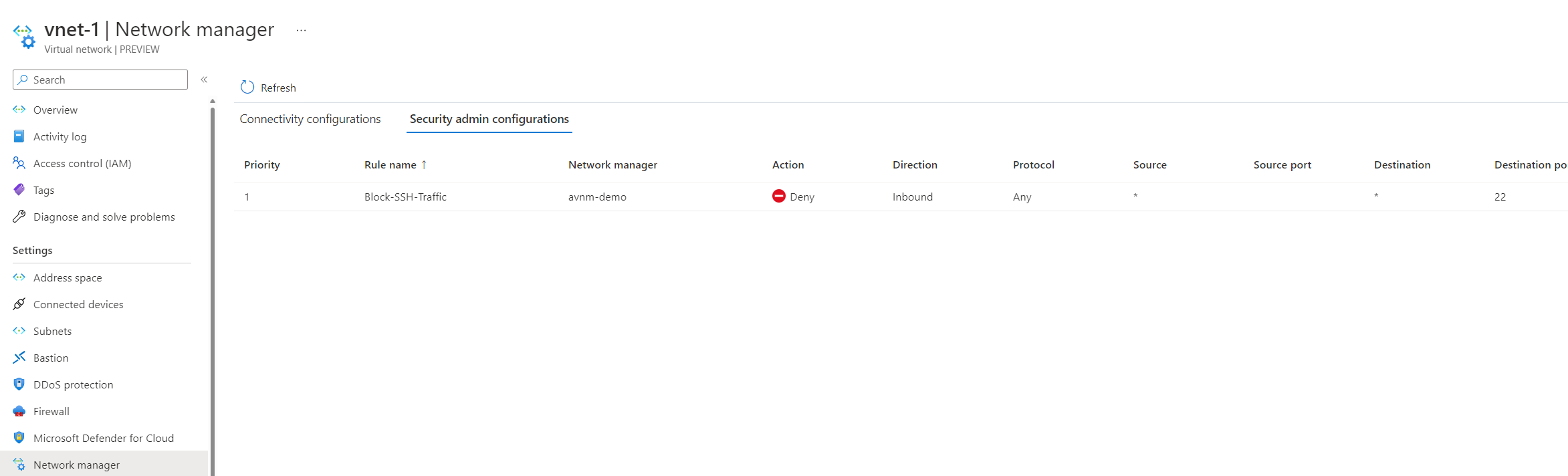 We can confirm it's been successfully deployed! How can we verify it worked? If you go to the virtual network resource and click network manager, go to the security configuration tab, and you should see the rule applied.
