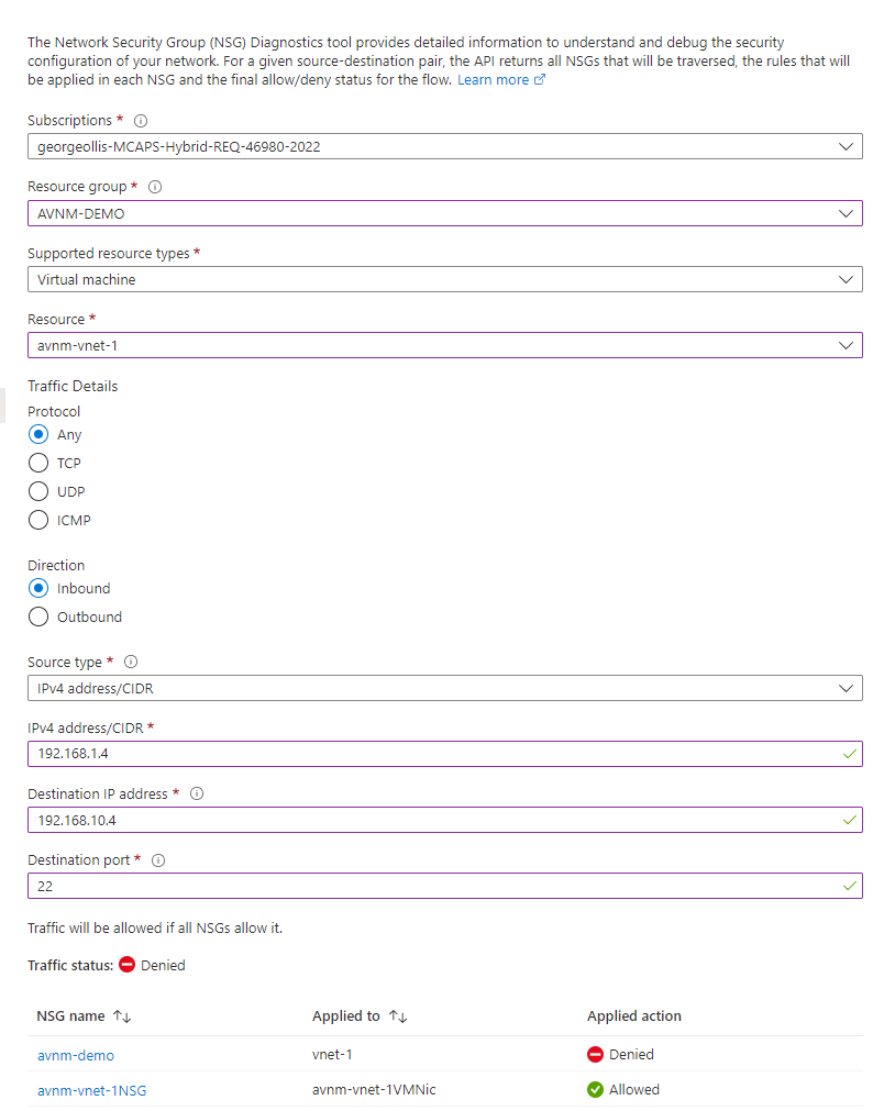 Using network watcher, specifically the NSG diagnostics tool, we can confirm that the AVNM security configuration is blocking traffic. It's interesting to see this through the NSG diagnostics tool.