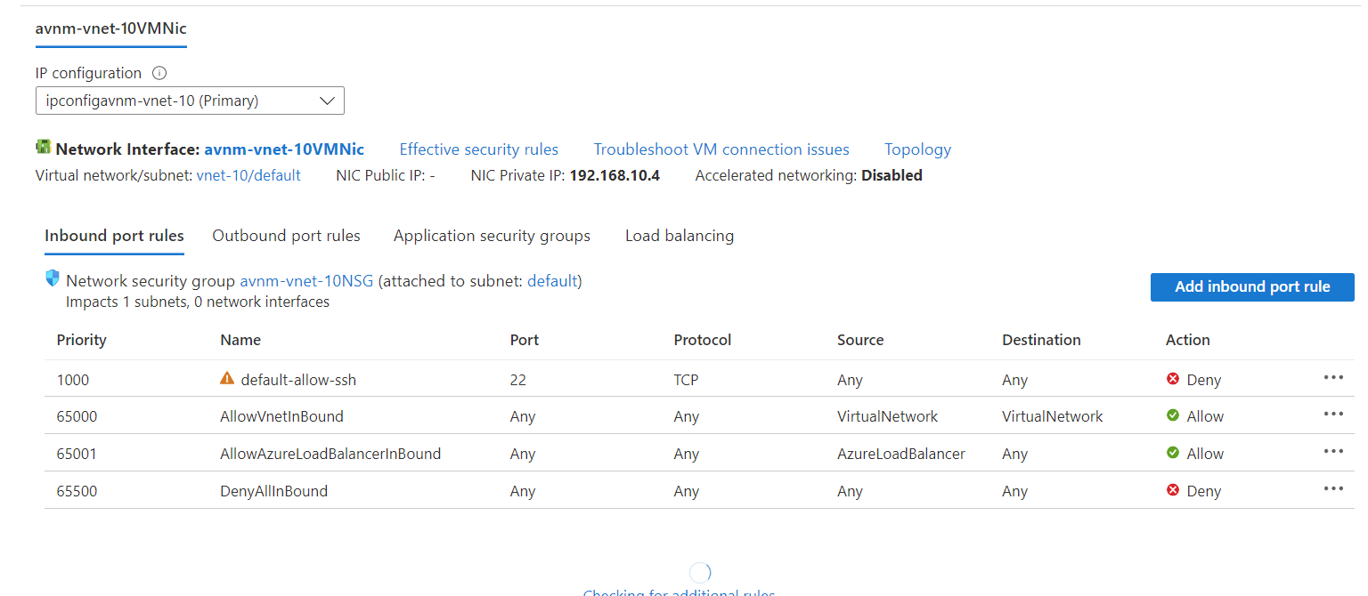 We've blocked NSG traffic to port 22 on the default subnet in vnet-10.