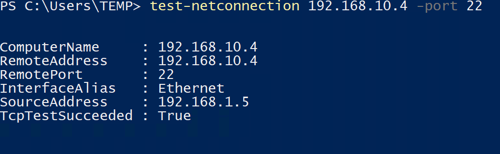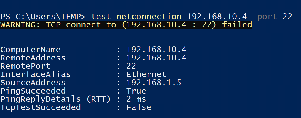 This theoretically should mean that the AVNM security configuration will allow the traffic through, but it will then get blocked by an NSG. This time we can confirm that's the case by using a Windows machine running in vnet-1 to run a Test-NetConnection to 192.168.10.4 on port 22.
