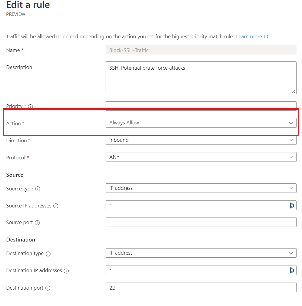What if we changed the security configuration to allow port 22 traffic and blocked it at the NSG instead? Here's a screenshot showing it's enabled.