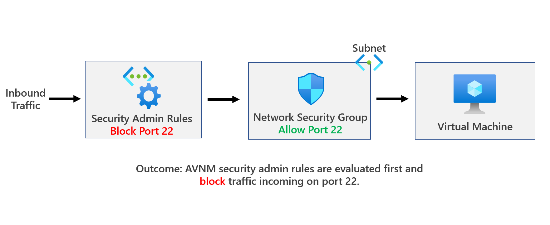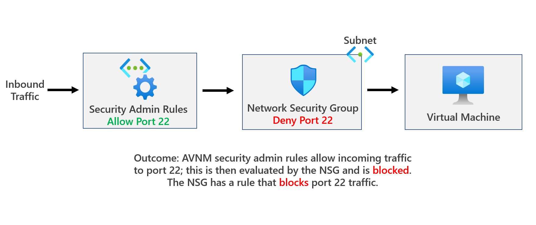 When Deny is used, traffic is evaluated by the security admin rules first, and therefore traffic is stopped without being delivered to the destination even before hitting an NSG. This means you can use security admin rules to set definitive security rules that can't be overridden by others. More info here: Security admin rules in Azure Virtual Network Manager (Preview) | Microsoft Learn