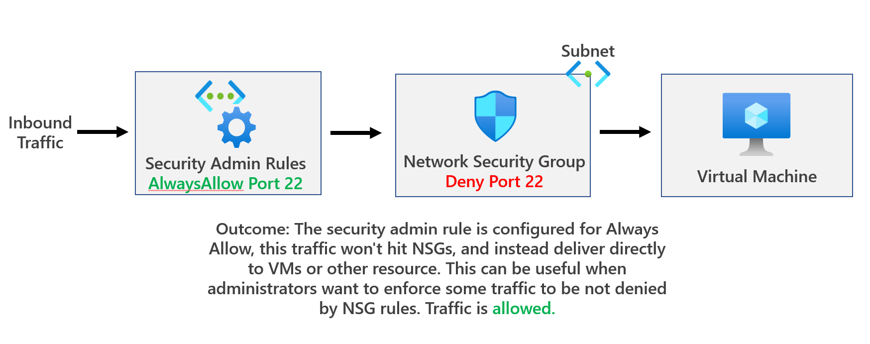 If the security admin rule is Always Allow, the traffic won't hit NSGs, and, instead, deliver directly to VMs or other resources. This can be useful when administrators want to enforce some traffic to be not denied by NSG rules. More info here: Security admin rules in Azure Virtual Network Manager (Preview) | Microsoft Learn