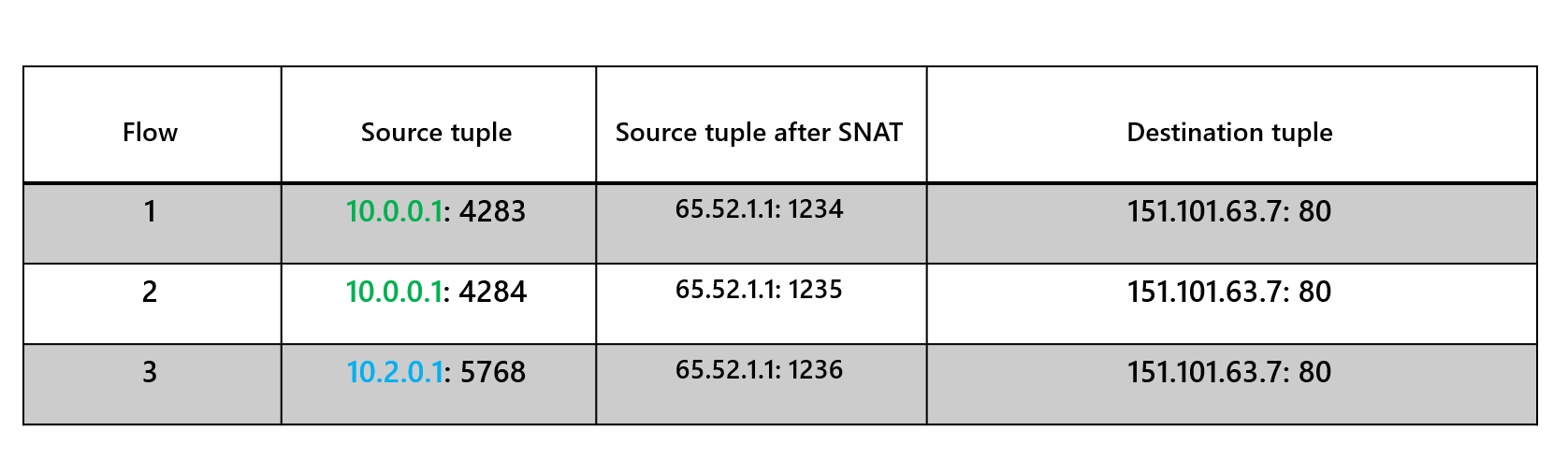 When the NAT gateway is configured with public IP address 65.52.1.1, each virtual machine's source IPs are translated into the NAT gateway's public IP address and a SNAT port.