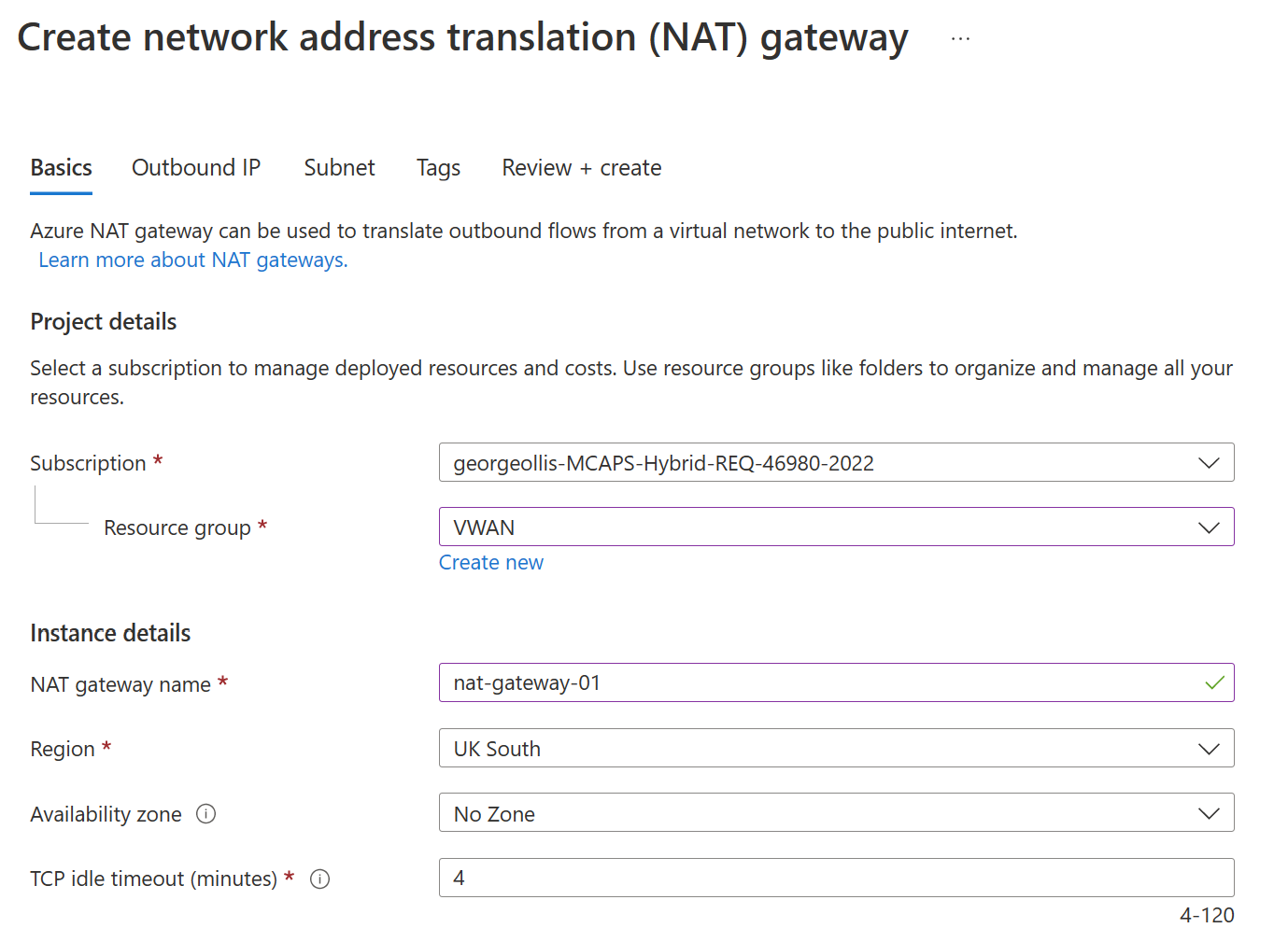 In the first section, we are asked to provide default information, such as name, resource group and location. We also need to decide our availability zone and TCP idle timeout configuration.
