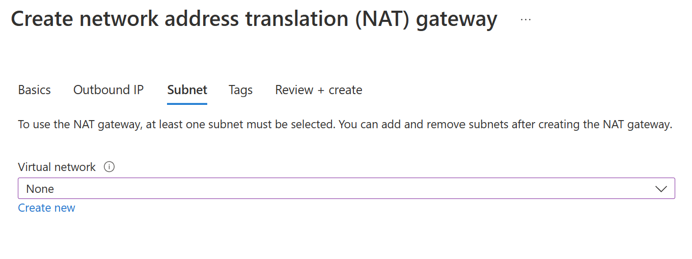On the final page, we can select which virtual network and subnets we can associate with the NAT gateway. It's important to note that A NAT gateway can't span multiple virtual networks.