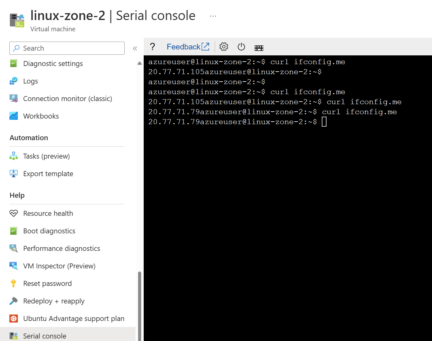 Our NAT gateway has two public IP addresses attached, 20.77.71.79 and 20.77.71.105. If I log in to my Linux VM and run the command: