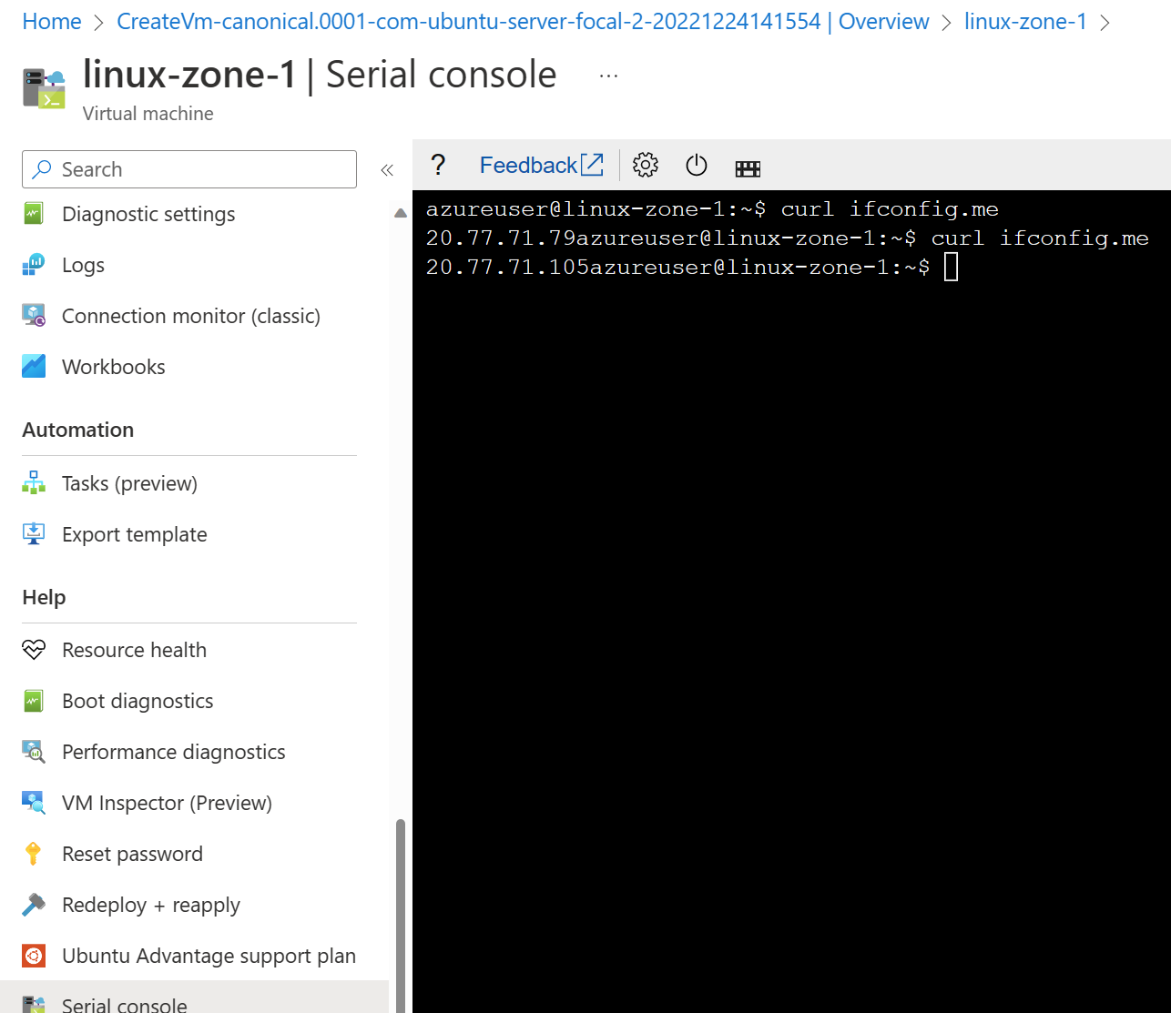 curl ifconfig.meThis will return the outbound public IP address used by the VM when going outbound to the internet.
