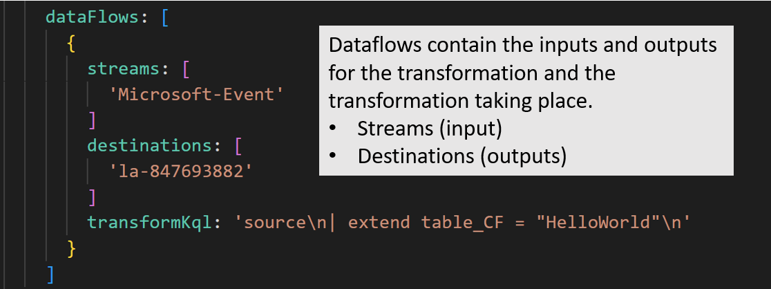 The dataflows block contains the inputs, outputs and transformations that will be complete. Our example takes logs coming in from the Microsoft-Event stream, completes the KQL transformation and sends it across to the destination.