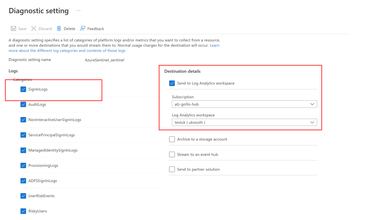 Let's confirm that our diagnostic settings from Azure Active Directory are going to the correct Log Analytics Workspace. This can be done by going to Azure Active Directory and clicking diagnostic settings.