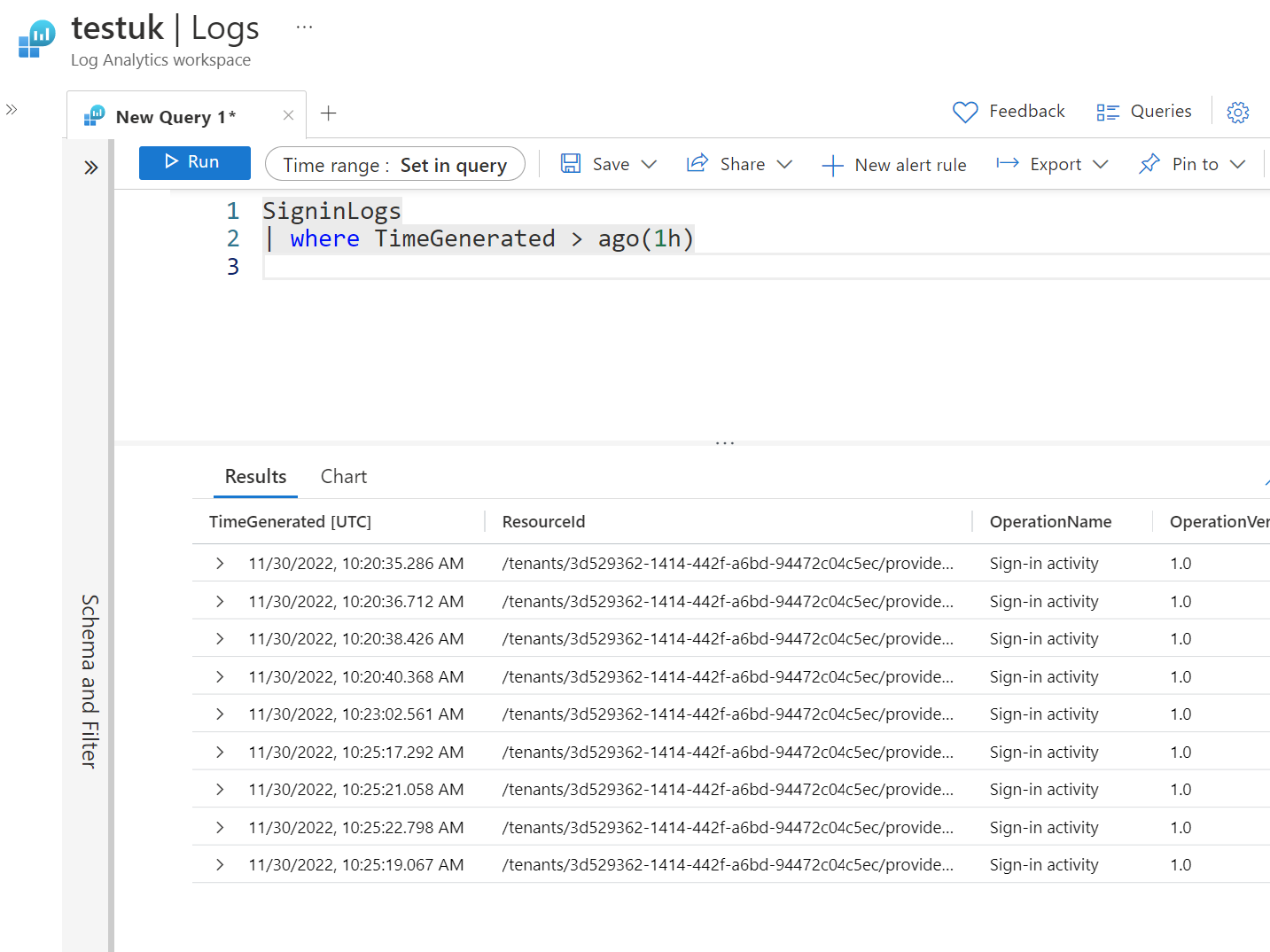 Once confirmed, let's go to the Log Analytics Workspace and ensure that the data is being ingested. This small query below will return all sign-in activity from the last hour.