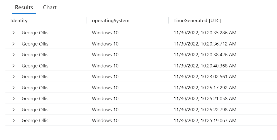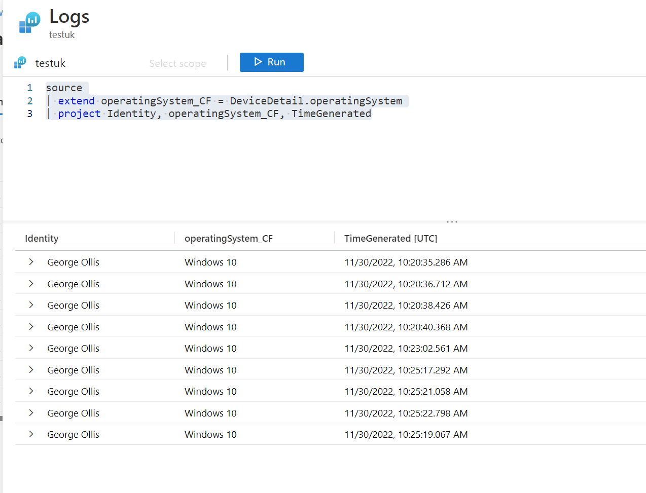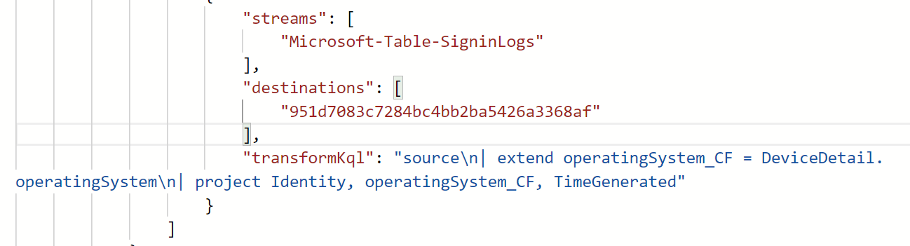 | project Identity, operatingSystem_CF, TimeGeneratedHowever, for example, the operatingSystem property is nested within the DeviceDetail object. What if we never wanted to run the query without the extend operator? We want the operatingSystem always to have its column. This is where the power of DCR transformations comes in!