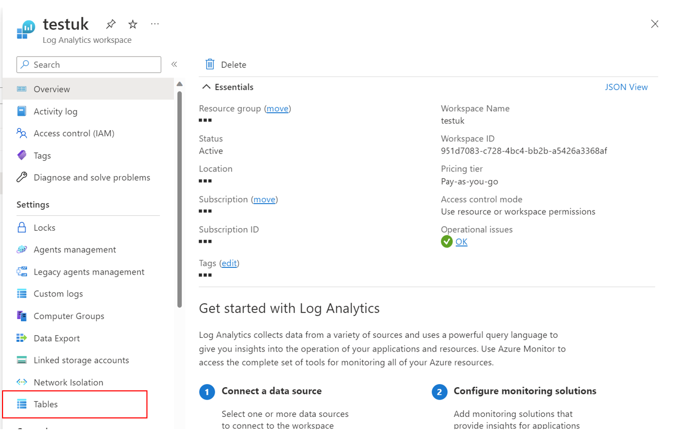 Let's go ahead and set one up. Go over to the Log Analytics Workspace and click on tables.