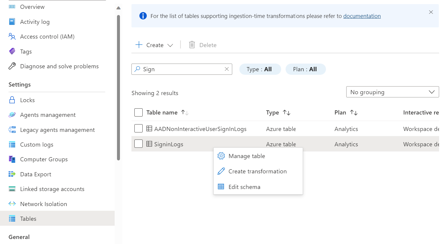 Search for the SignInLogs table, right-click on the table and then click create transformation.