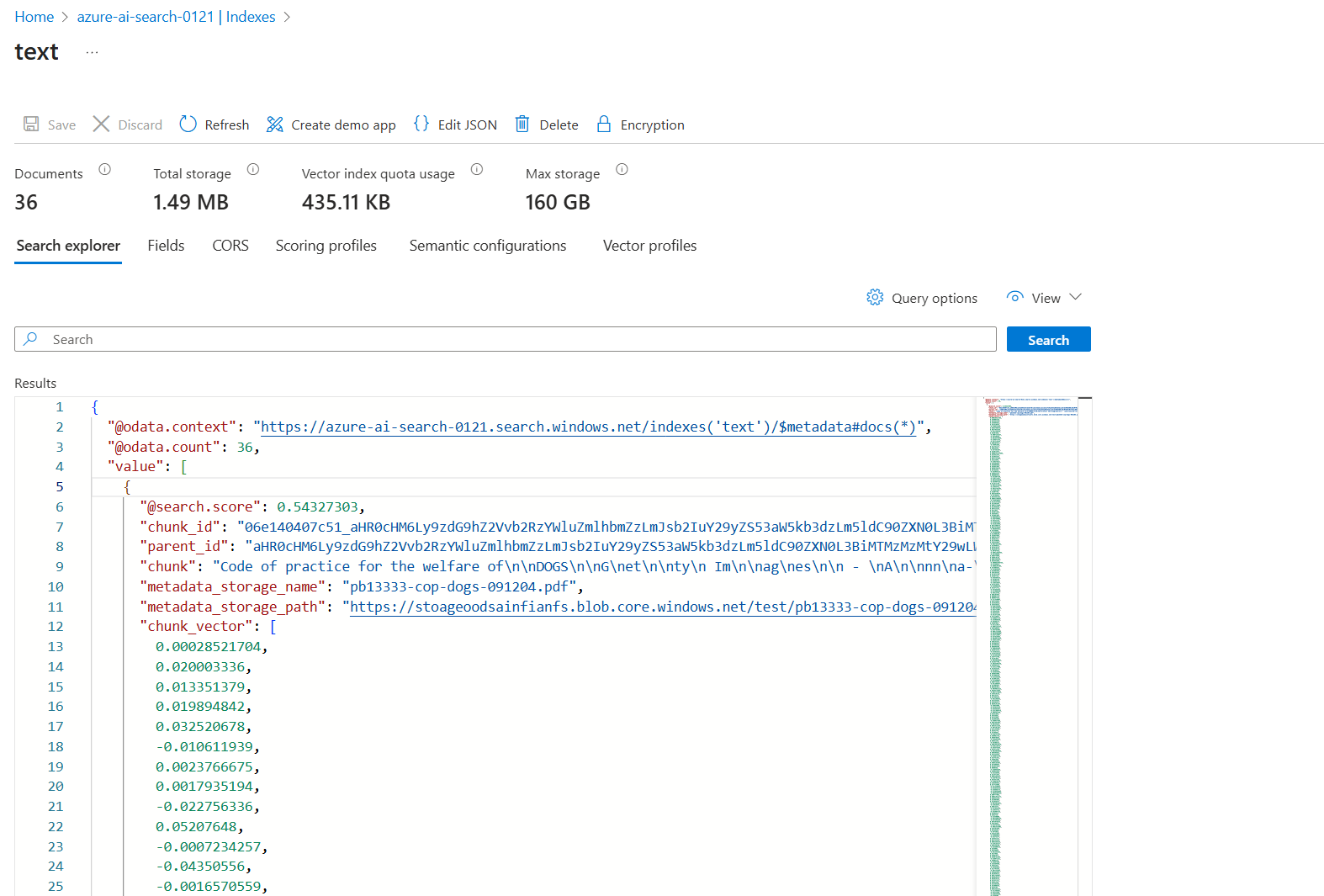 When we upload data into the blob storage account and run the indexer, we can see that our index is fully populated.