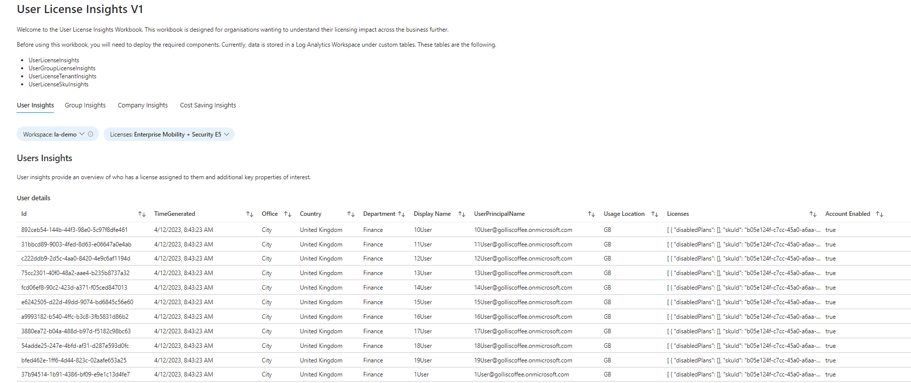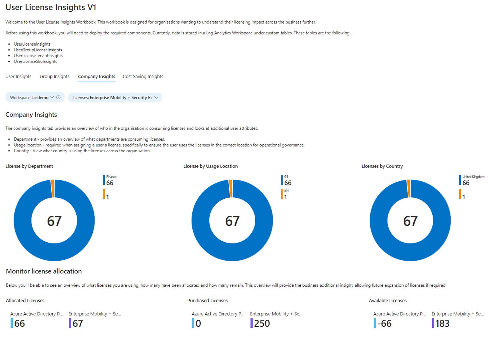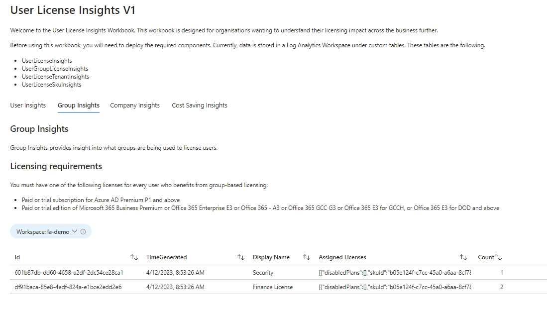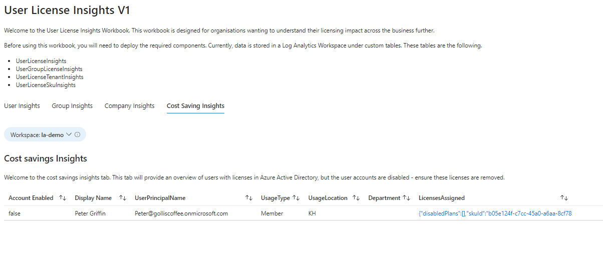 The workbook is called License Insights and uses several custom tables in log analytics. These are the following: