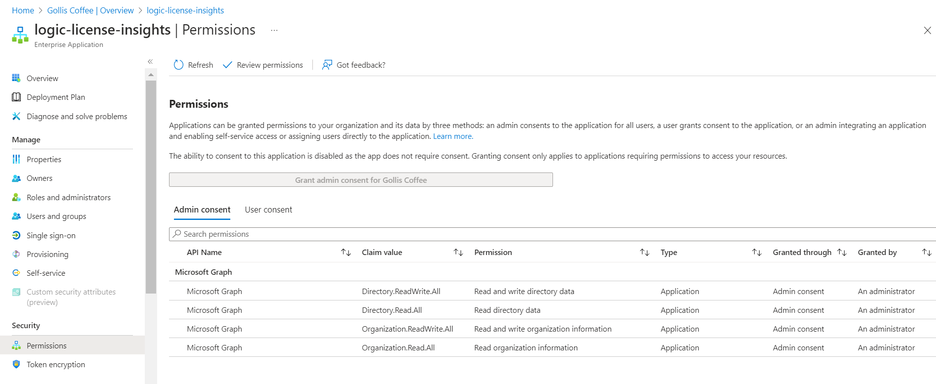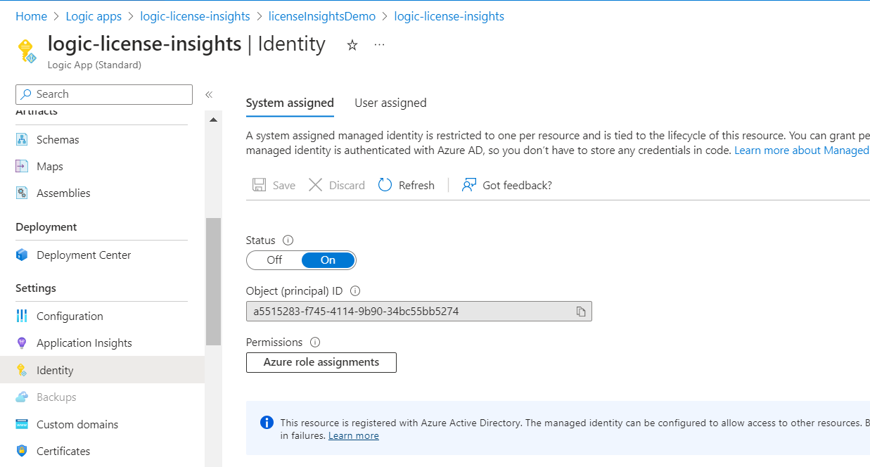 Add-GraphApiRoleToMSI -ApplicationName "logic-license-insights" -GraphApiRole "Directory.Read.All" -Token $token.token You can view the managed identity's permissions in Azure Active Directory by going to the enterprise application, which represents your managed identity.