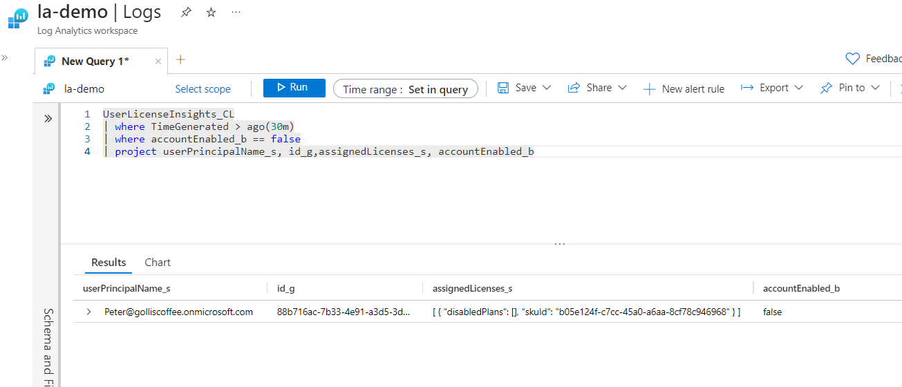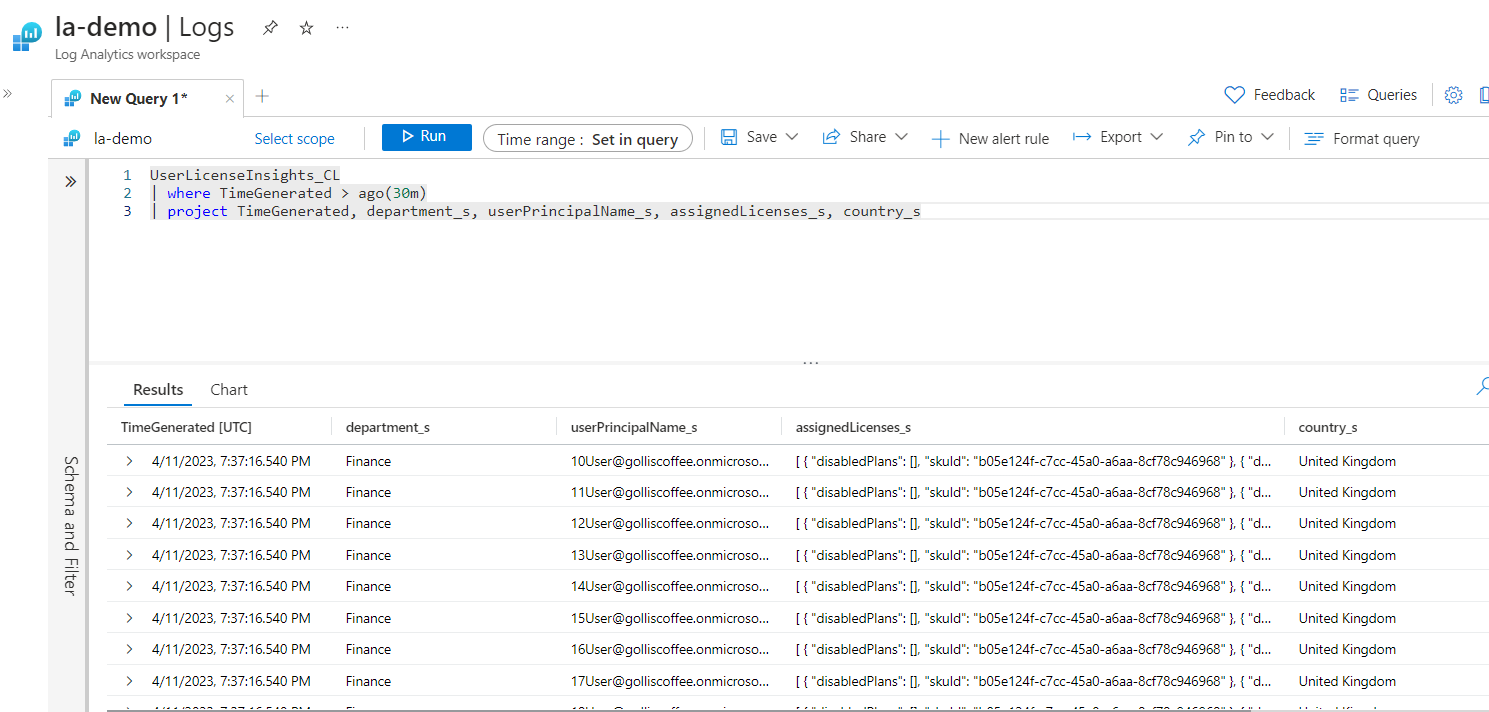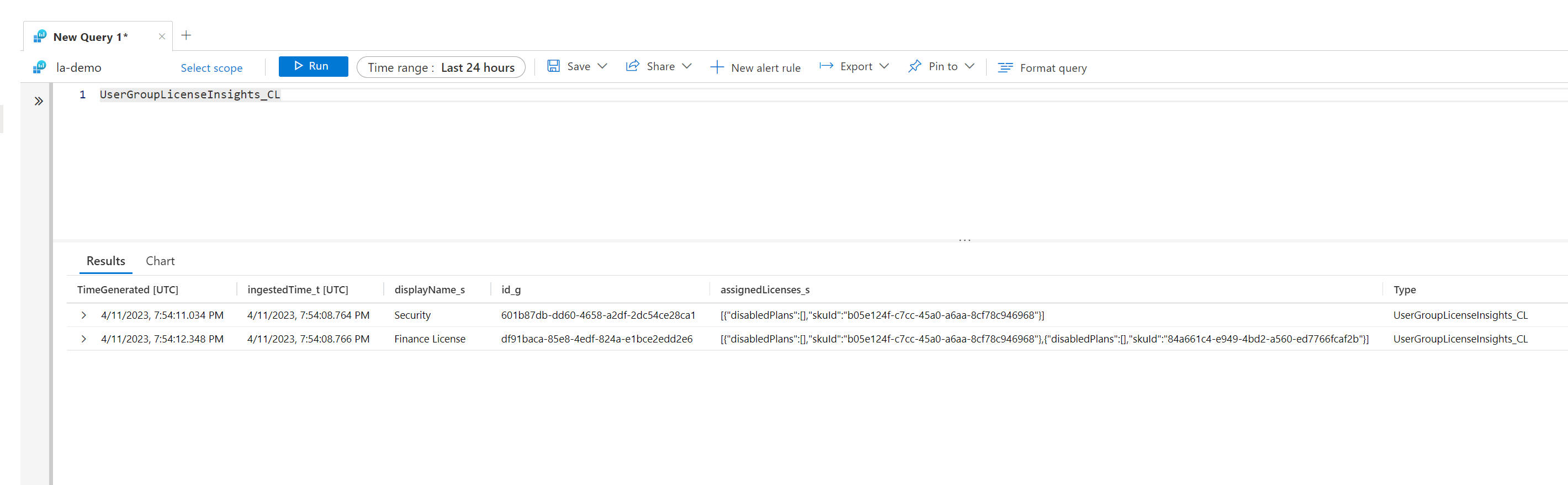 This data is being sent again to the same Log Analytics Workspace but to a separate table. The table is called UserGroupLicenseInsights. We can run another KQL query to view the same helpful information about groups that have licenses assigned.