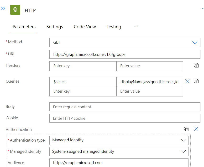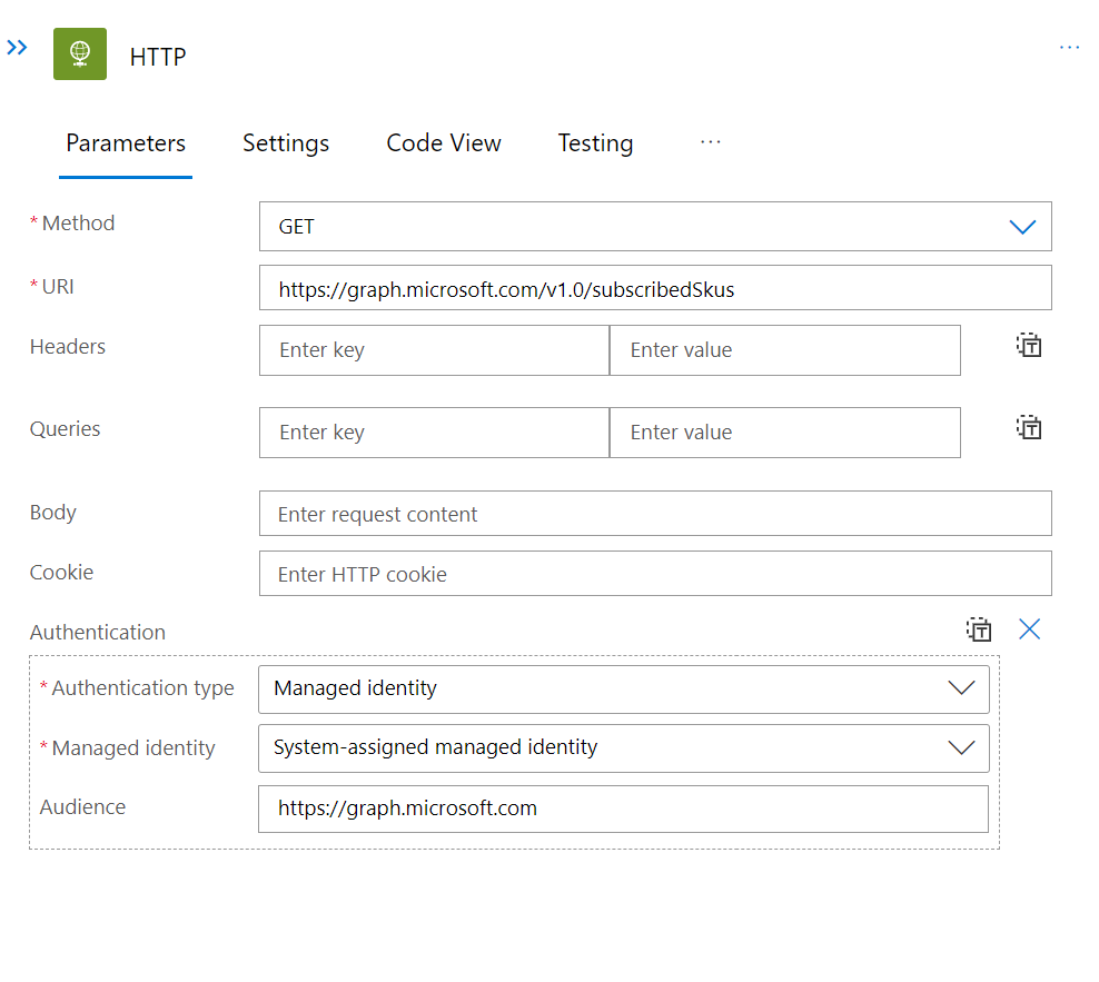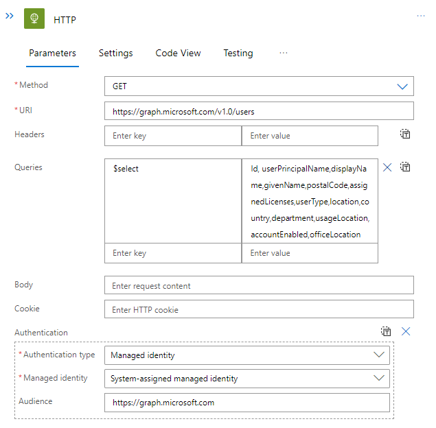 The first workflow will run every 30 minutes and does a direct HTTP GET call to the endpoint https://graph.microsoft.com/v1.0/users. Authentication is done through the system-assigned managed identity.