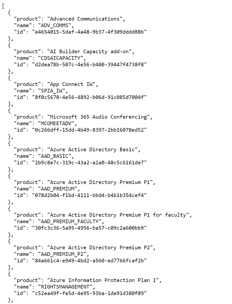 One property that neither the subscribedSku's, Users and Groups API calls provide is a friendly way of understanding what the SkuId is. This is probably one of the more valuable properties, and it's not here. How do we get this, then?