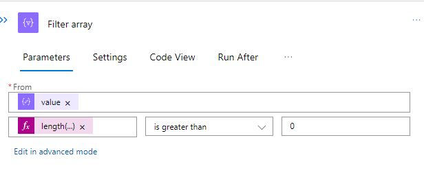 Once the call to retrieve all users is completed, we parse the HTTP output using the parse JSON action. This allows us to use the properties in additional steps. In our case, we perform a filter on the returned array and filter for assigned licenses greater than 0. This means we are only returned users with licenses.