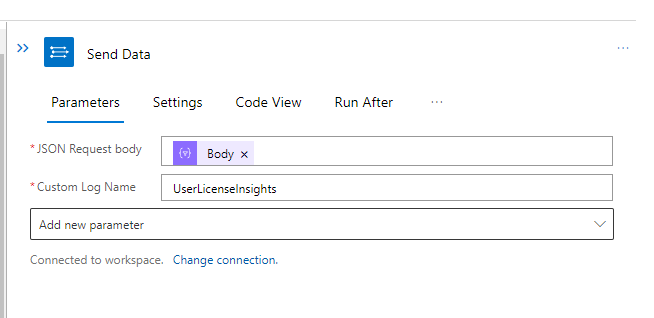 The final step takes the body and content from the filter array action and sends that to the Log Analytics Workspace.
