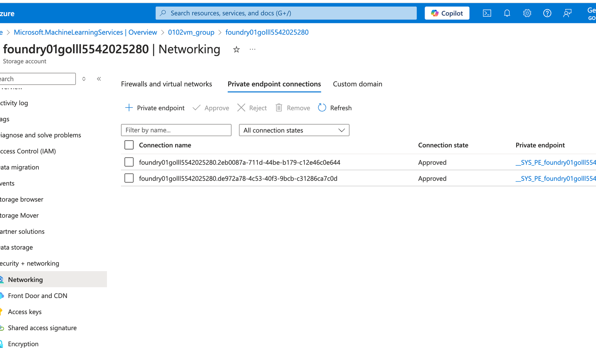 Once deployed, go to the Azure AI Foundry hub storage account. Two private endpoints (blob and file services) are connected. The hub resource can access the content within the storage via the managed private endpoint.